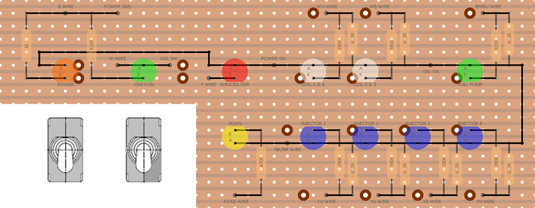 Note that as well as series resistors, the LEDs for the ignition and injection outputs have low value pull-up resistors to the +12V supply rail. The ECU outputs which drive these are transistor switched which saturate to ground when turned on. These are high current outputs designed to switch around 1A in the case of the injectors and 10A in the case of the ignition coil packs. Without the pull-up resistors, leakage through the ECU drivers allows enough current to pass to light the LEDs fairly brightly even when turned off (only a couple of milliamps is required), making it very hard to distinguish between the on and off states. The pull-up resistors fix this by requiring a minimum current before the forward voltage of the LEDs is reached, giving a much clearer on/off action. Suitable values for all of the resistors are shown in the diagram, which again very according to the colours of the LEDs.