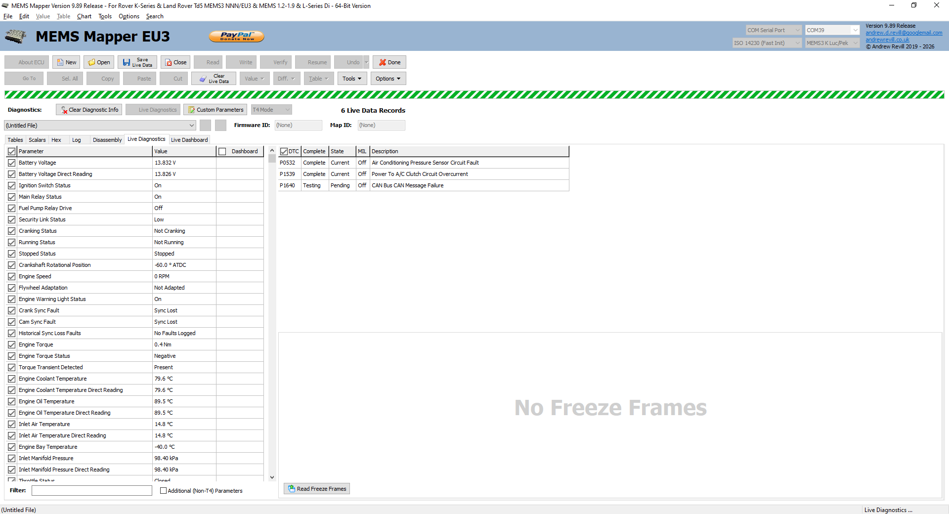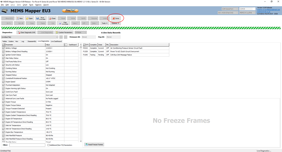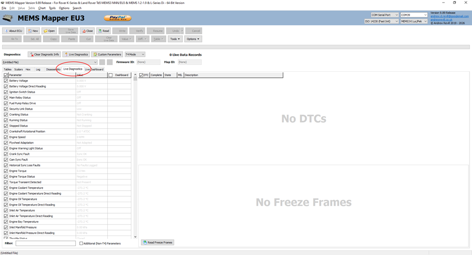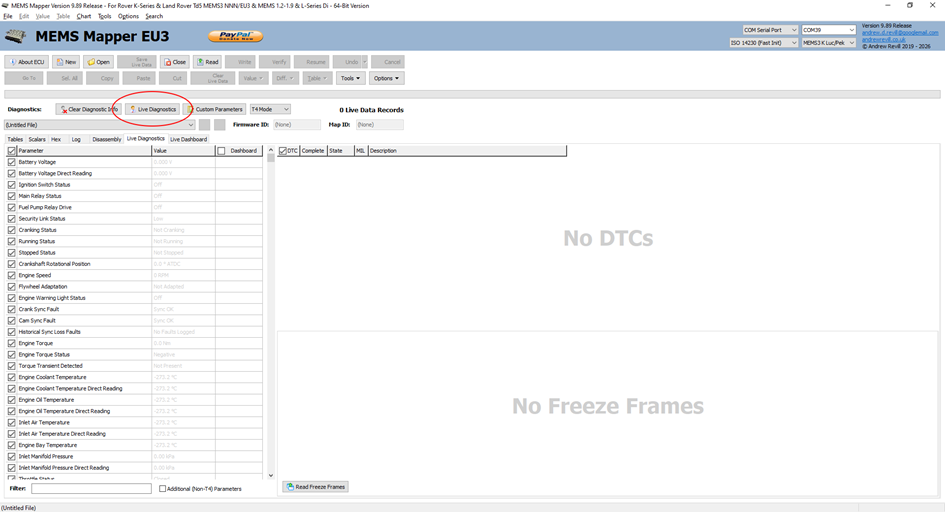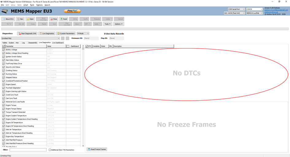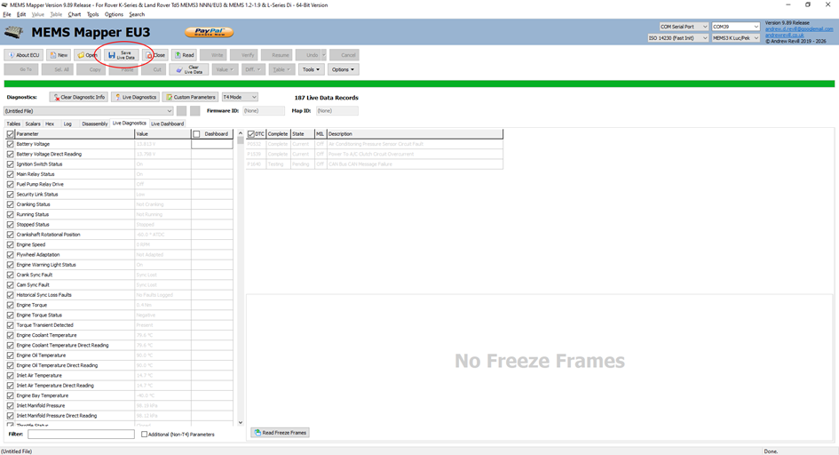 · You are now ready to view Live Diagnostics, fault codes and to data log the ECU (record the Live Diagnostics data and save to a file).