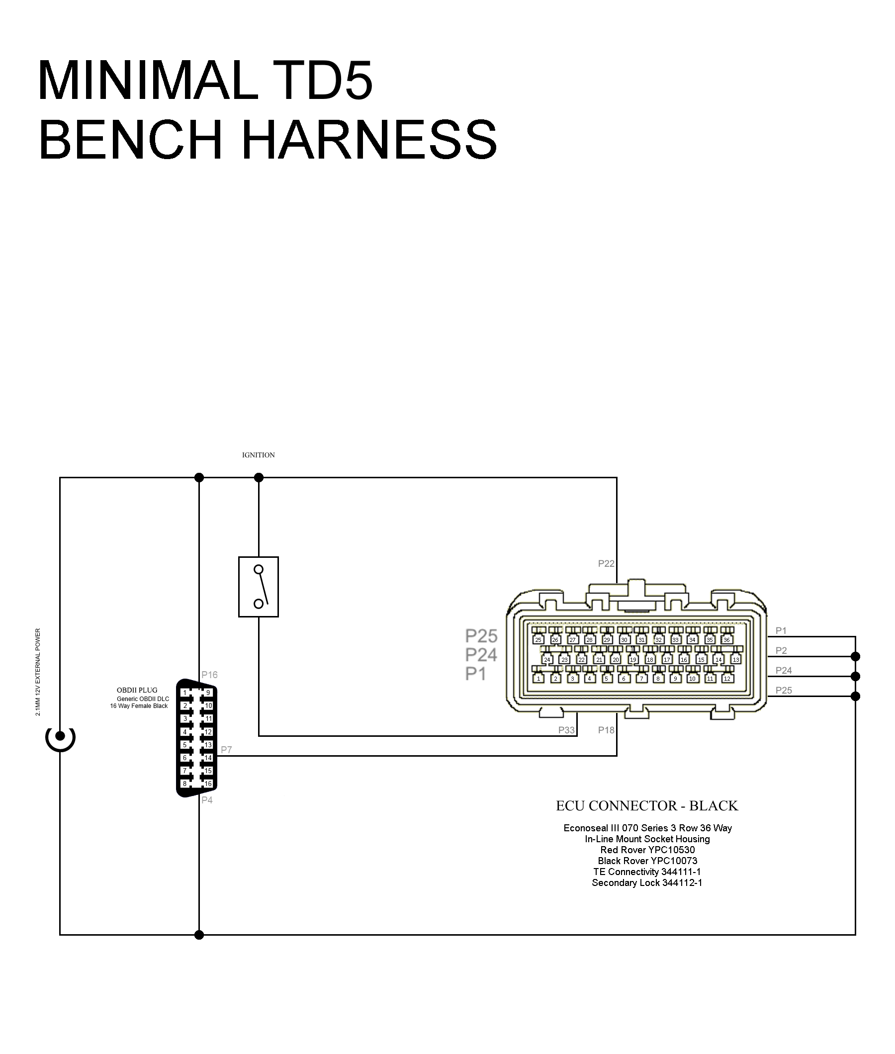 The designs for the bench harnesses I use are documented within the article Building a Key Programming & ECU Immobiliser Testing Interface, but those include the immobiliser connections and other facilities such as injector and ignition coil indicator LEDs which are useful when programming key fobs etc. but not strictly necessary when just programming or testing the ECU. The diagrams below show the absolute minimal bench harnesses which allow the ECUs to be powered and to communicate over the OBDII port: